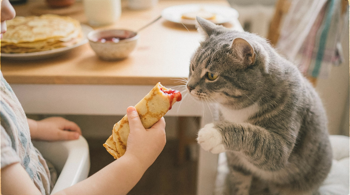 – Ой, бабуль, Фомка тоже хочет блинчиков! Смотри, как смотрит!