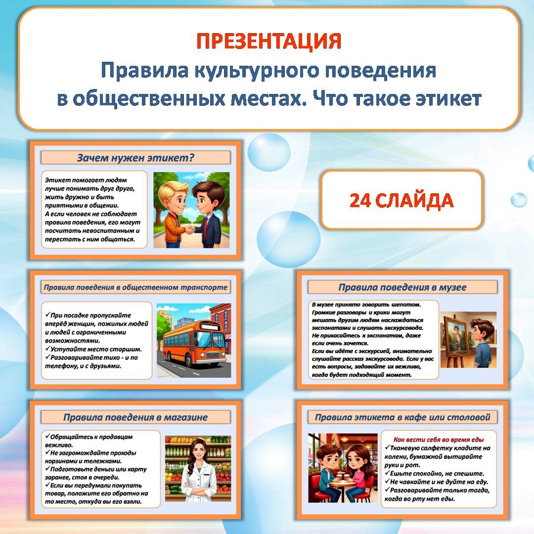 Презентацию скачать здесь Презентация «Правила культурного поведения в общественных местах. Что такое этикет» разработана к уроку окружающего мира во 2 классе. Данная разработка станет хорошим визуальным сопровождением не только для урока, но и для классного часа со схожей тематикой. Текст презентации написан простым и понятным языком, слайды не перегружены информацией. Красочные иллюстрации помогут оживить ваш урок и вызовут интерес у учащихся. Презентация состоит из 24 слайдов. Содержание презентации: Слайд № 1. Титульный слайд. Слайд № 2. Что такое общественное место. Слайд № 3. Что такое этикет. Слайд № 4. Как появилось понятие «этикет». Слайд № 5. Зачем нужен этикет? Слайды № 6-10. Общие правила культурного поведения в общественных местах. Слайд № 11. Правила поведения на улице. Слайды № 12-13. Правила поведения в общественном транспорте. Слайд № 14-15. Правила поведения в театре и кинотеатре. Слайд № 16. Правила поведения в музее. Слайд № 17. Правила поведения в библиотеке. Слайд