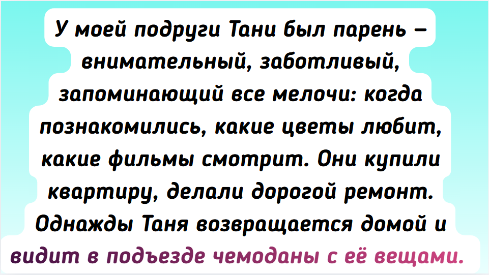 - У моей подруги Тани был парень — внимательный, заботливый, запоминающий все мелочи: когда познакомились, какие цветы любит, какие фильмы смотрит. Они купили квартиру, делали дорогой ремонт. Однажды Таня возвращается домой и видит в подъезде чемоданы с её вещами. Парень закрылся внутри и не отвечает на звонки. Денег у Тани немного, она приходит ко мне ночевать. На следующий день она решает забрать свои вещи, и обнаруживает записную книжку с досье на всех его девушек: имена, внешность, любимые цветы, даты встреч. Таня видит, что за последние недели он встречался с другими девушками. Она несколько часов рыдала, а затем разорвала блокнот на листы и приклеила их на обои, кафель и линолеум с термоядерным клеем. Бумажки парень, конечно, снял, но клей остался. Ремонт пришлось переделывать и тратить кучу денег. Вечером он позвонил, начал кричать, а Таня на третьей минуте положила трубку. Легче стало, но не полностью. © Deleted User / ADME