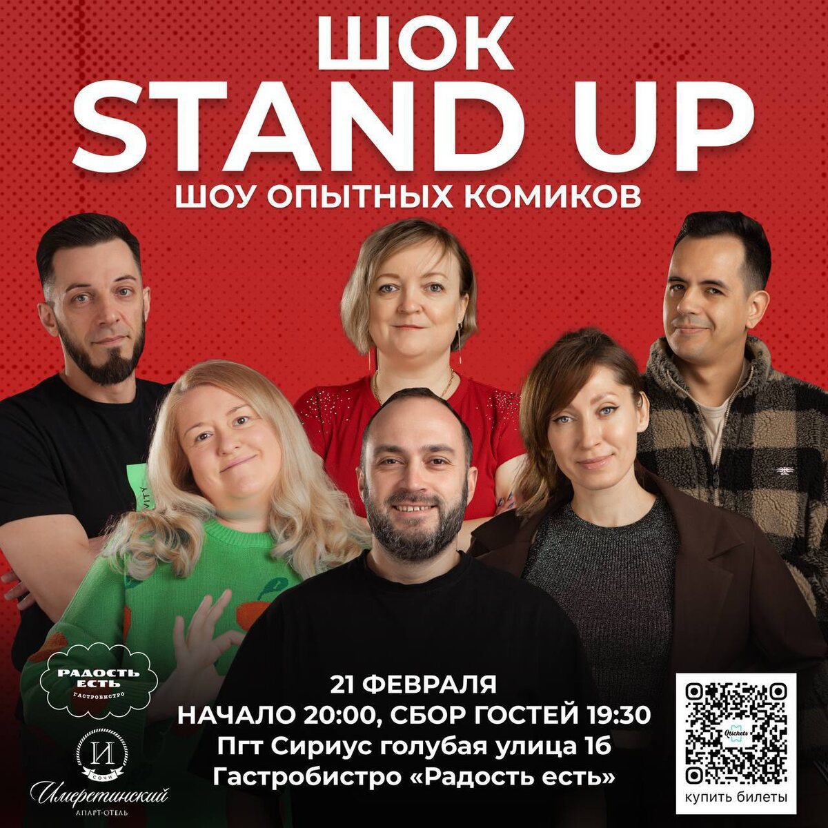! 21 февраля в гастробистро «Радость есть» состоится СТЕНДАП ШОК: шоу опытных комиков с сильным, проверенным материалом и живой импровизацией! Приходите поужинать, выбрать напиток под настроение и просто классно провести вечер 🙌 21 февраля в 20:00 гастробистро «Радость есть» по адресу: Голубая 1Б билеты по ссылке: sirius.qtickets.events/215488-stendap-shok-shou-opytnykh-komikov 8 (938) 489 06 01 Количество мест ограничено 18+