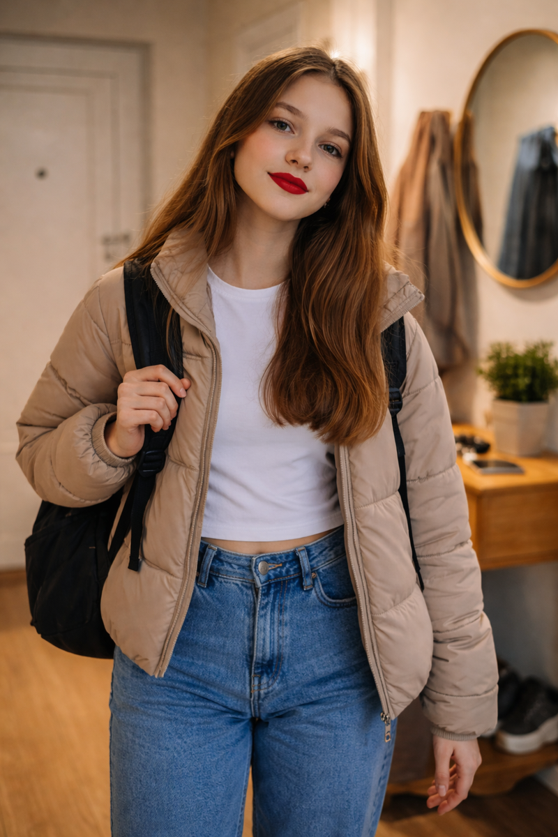 Даша замерла, в одной руке — рюкзак, в другой — телефон. На губах — яркая помада, которую она купила на карманные деньги.