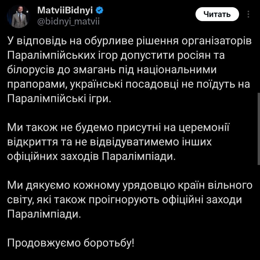 Паралимпиады с флагом и гимном, объявил, что украинские спортивные чиновники объявляют бойкот таким играм. «В ответ на возмутительное решение организаторов Паралимпийских игр допустить россиян и белорусов к соревнованиям под национальными флагами украинские чиновники не поедут на Паралимпийские игры. Мы также не будем присутствовать на церемонии открытия и не будем посещать другие официальные мероприятия Паралимпиады. Продолжаем борьбу!» 🤡 Сальное Дифлопэ