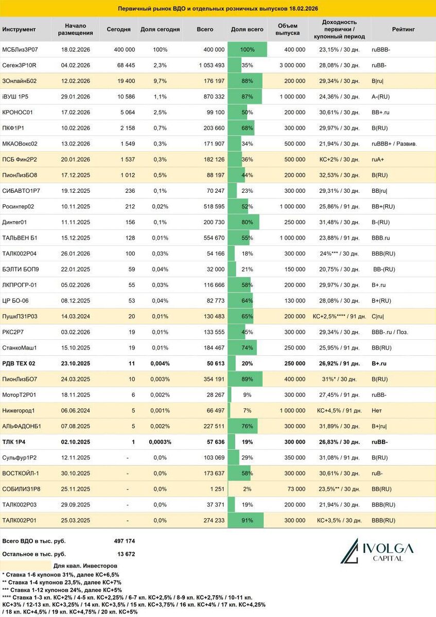 Итоги первичных размещений ВДО и некоторых розничных выпусков на 18 февраля 2026 г.