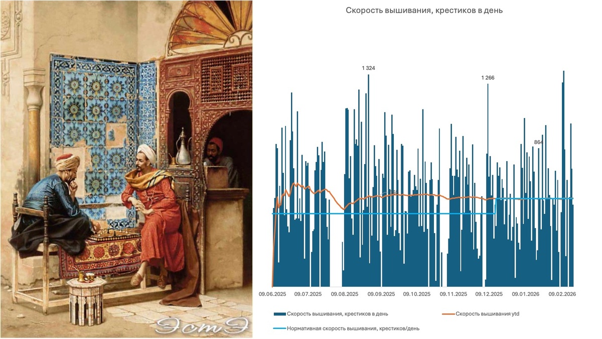 Пока не знаю, когда буду дарить: на 8-е марта или перед майскими праздниками. Но знаю, что кайрос может представиться перед 8-м марта, значит, у меня должно быть все готово. Кстати, про кайрос. Это не имя греческого бога, а умное слово из тайм-менеджмента. Обозначает подходящий момент, когда наиболее удобно что-то сделать/можно что-то сделать с минимальными затратами времени/энергии. Кроме того, я свела дебет с кредитом по своей "Игре в шахматы" и поняла, что у меня есть 2,5 дня для создания этой броши. Именно такой запас времени сформировался за счет чуть более высокой скорости вышивания (спасибо почти однотонным проемам). Вот ссылка на описание подхода к планированию сроков и скорости вышивания -