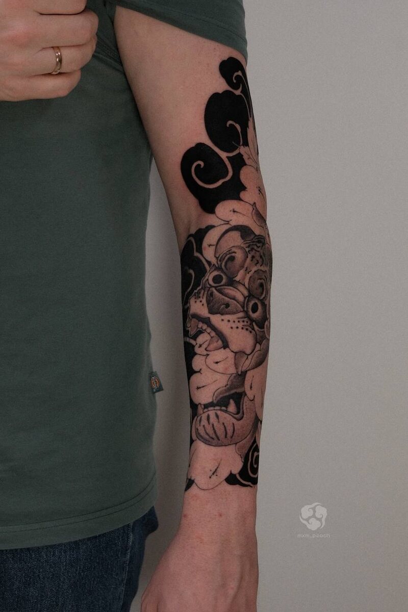 Закончил татушку с тигром и пеоном в облаках.