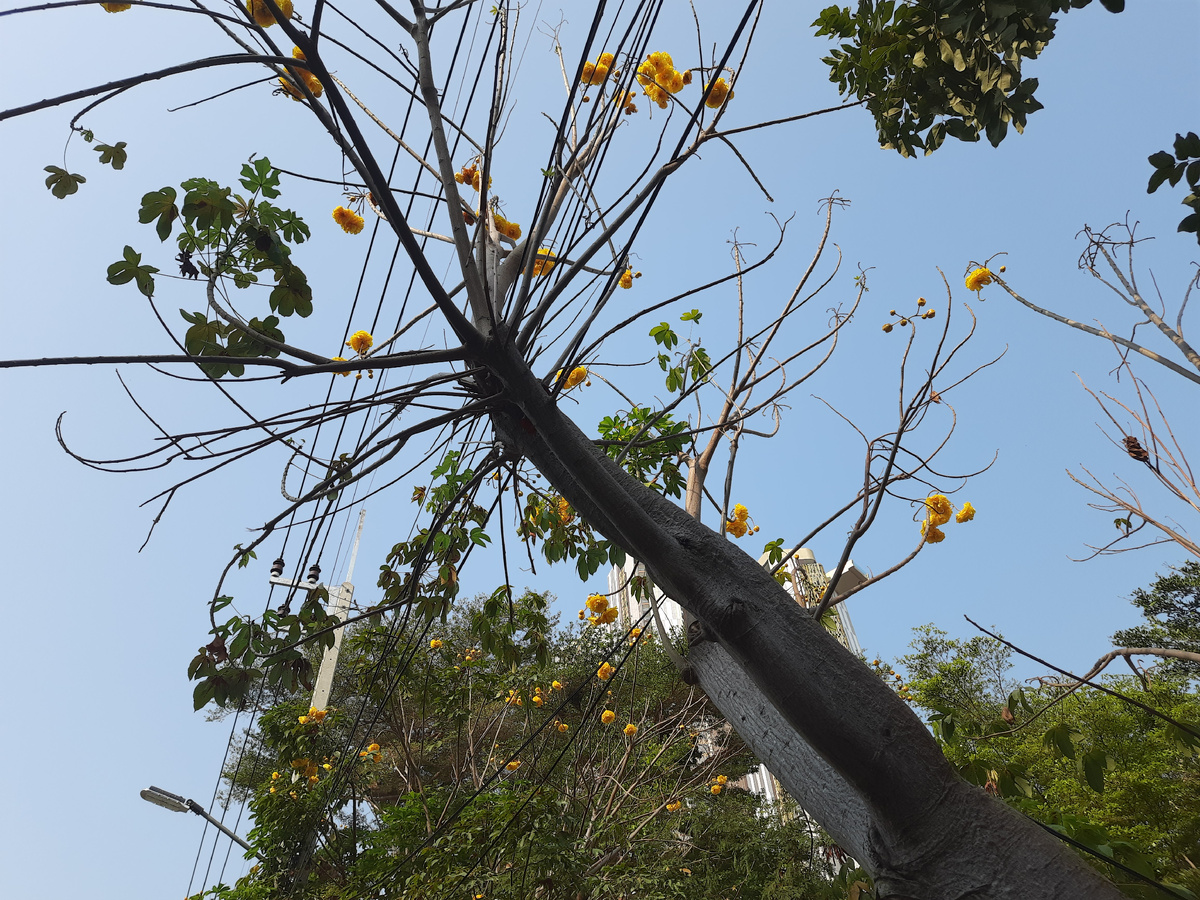 Каждый раз любуюсь цветами по дороге. Есть тут интересное дерево практически без листьев, но с крупными жёлтыми цветками, которые опадают на землю, и под деревом образуется цветочный жёлтый ковёр.