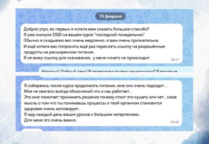 никто не любит читать отзывы 🙃 Но не могу не поделиться, потому что гордость меня переполняет за эту отважную девушку! Предпоследний поток курса "Мой Последний Понедельник". Наталья купила тариф без обратной связи. Минус 5,5 кг за месяц. Не 15. Не «минус половина себя». И стартовый вес был небольшой. Но знаете, что здесь главное? Девушка прошла курс без обратной связи. Без вопросов, без нытья и жалоб. Без «а можно заменить?». Без «ой, а если печенька?». Она просто смотрела уроки. И поняла процессы. И вот это — важнее цифры. Сейчас конец зимы. И половина женщин — в заложниках у холодильника. Сначала: «Ну зима же. Организм требует». Потом: «Ну ладно, весной начну». А потом весна приходит. И вместе с ней приходит депрессия: в это не влезла, это не застёгивается, фото в полный рост — враг. Худеть нужно не к 8 марта. И не к отпуску. Худеть нужно, если вы хотите: — энергию, — нормальную кожу, — ясную голову, — и не ускорять старение каждым «ну ладно». Потому что похудение — эт