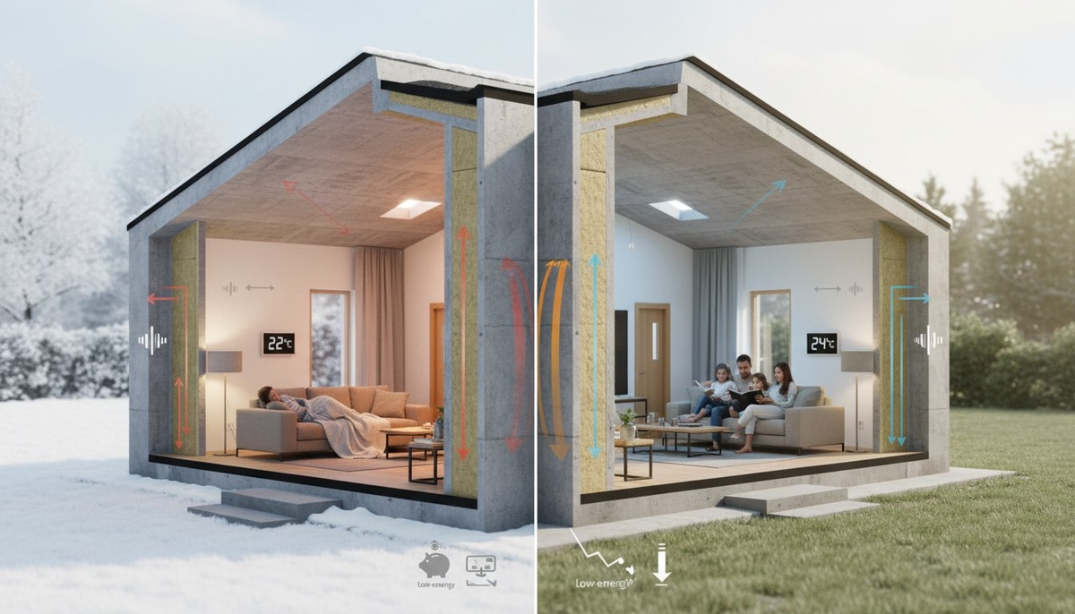 ? Или дом превращается в сауну летом и в холодную коробку зимой? В SCIP-стене утеплитель встроен внутрь панели и работает без разрывов — нет мостиков холода и разношерстных примыканий. Зимой дом проще прогреть и удержать тепло, летом стены медленнее нагреваются и кондиционер не гоняет постоянно. Круглый год — ровный микроклимат и заметно тише: монолит «бетон+утеплитель+жёсткая связь» гасит звук. По отзывам владельцев счета ниже, чем у сопоставимых домов из газоблока. Хотите, мы посчитаем экономию для вашего участка? 🏠💤💸