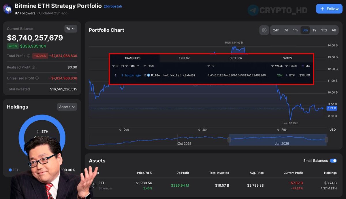 Нереализованный убыток Bitmine от инвестиций в #ETH сейчас превышает $7,820,000,000 (portfolio) Минус Sharplink (еще одного ТОП-холдера Ethereum) превышает $1,340,000,000. На балансе этой компании хранится 865,841 ETH ($1,7b) Ранее: покупки на прошлой неделе Crypto Headlines