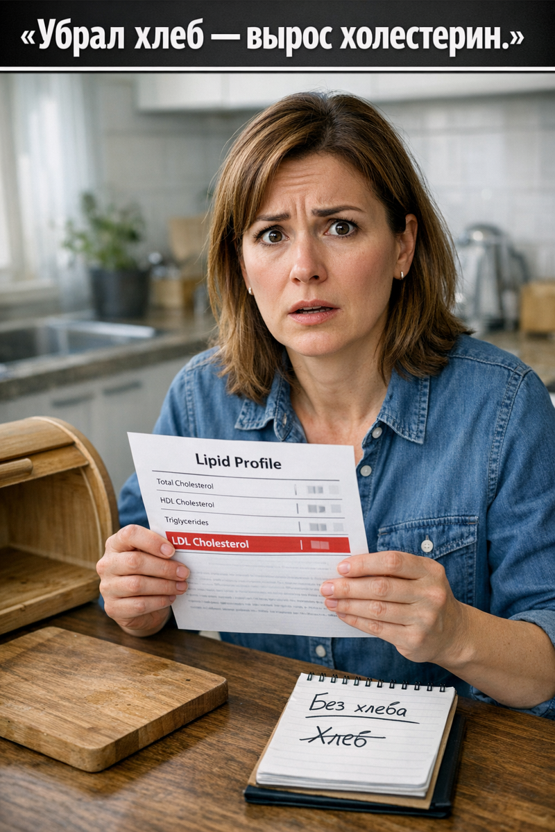 Убрал хлеб — вырос холестерин. Да, именно так. Вы каждый день резали хлеб, ели крупы, и ваш организм жил в балансе. Исключили? Баланс сломался. LDL подрос, печень начала компенсировать отсутствие клетчатки, а уровень жиров в крови изменился. Вы думали, что низкоуглеводная диета — это только минус лишние калории? Нет. Это вызов для вашего холестерина. То, что казалось «здоровым отказом от хлеба», может обернуться ростом «плохого» холестерина. И да, здесь не нужны исследования, чтобы почувствовать эффект: ваш организм реагирует, даже если вы этого не видите. Когда вы исключаете хлеб и крупы, исчезает растворимая клетчатка, которая связывает желчные кислоты и помогает печени выводить холестерин. Без неё печень компенсирует — синтезирует больше холестерина. Баланс липидов смещается: часть жиров, которые раньше выводились вместе с клетчаткой, теперь остаются в организме. Даже без увеличения потребления жиров уровень LDL может подрасти. И микробиом перестраивается: меньше клетчатки — меньше