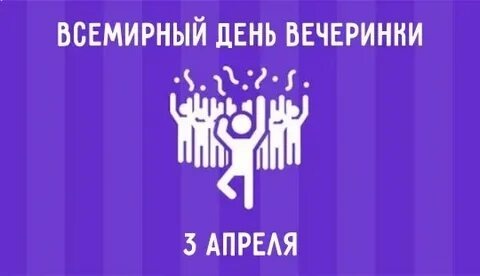 3 апреля – День вечеринок. 3 апреля отмечается весёлый неофициальный праздник – Всемирный день вечеринки или Всемирный день пати (англ. World Party Day). Также известный как P-Day. Слово «party», которое сегодня часто используется в лексиконе молодёжи, заимствовано из английского языка, по-русски обозначает вечеринку, причём любого уровня – от торжественного приёма до молодёжной тусовки в неформальной обстановке. Тематика, характер и сценарий мероприятия зависит от организаторов и участников. Вечеринки популярны во всём мире, ведь на них отдыхают, общаются или просто приятно проводят время. Однако, не смотря на весёлый характер праздника, он был создан с серьёзными намерениями. Дело в том, что идея организовать День пати пришла из фантастического романа «Полёт» американской писательницы Ванны Бонта (англ. Vanna Bonta, 1958–2014): повествование книги заканчивается обратным отсчётом до 3 апреля 2000 года, когда во всём мире должен пройти массовый праздник, объединяющий человечество. Этот