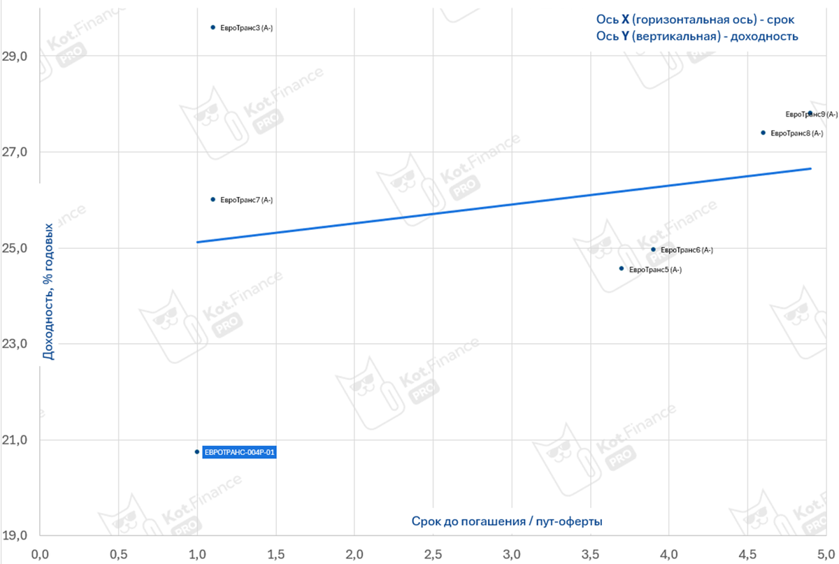 Размещение предыдущего выпуска стало мемов: эмитент продавал 9ый выпуск по любой цене, доведя цену до 86% от номинала а доходность до почти 28% годовых. Боюсь представить, что чувствуют те, кто купил по номиналу. Сейчас на размещении новый выпуск – не 10ый, а ЕВРОТРАНС-004P-01. Поможет ли новое название вернуть любовь инвесторов? О выпуске • ЕВРОТРАНС-004P-01 • Купон: 19% ежемесячно • Доходность: 20,7% годовых • Амортизация: - • Срок: 1 год • Объем: ₽2 млрд • Рейтинг: А-, прогноз стабильный (АКРА, Эксперт, НКР, НРА) ❓ Как связан рейтинг и дефолт? 👍Плюсы + это всё ещё рейтинг А, прогноз стабильный, перерейтингования свежие + отчетность неплохая, хоть большой объем – опт, который толком не раскрыт ❗️Риски 👉Наш обзор Евротранс 🐾Выпуски Евротранс одни из самых доходных в кредитном рейтинге А, однако частые размещения эмитента по любым ценам создают логичные вопросы у инвесторов. Мы написали в IR эмитента 2 недели назад с просьбой прокомментировать размещение 9го выпуска. Ответ не получи