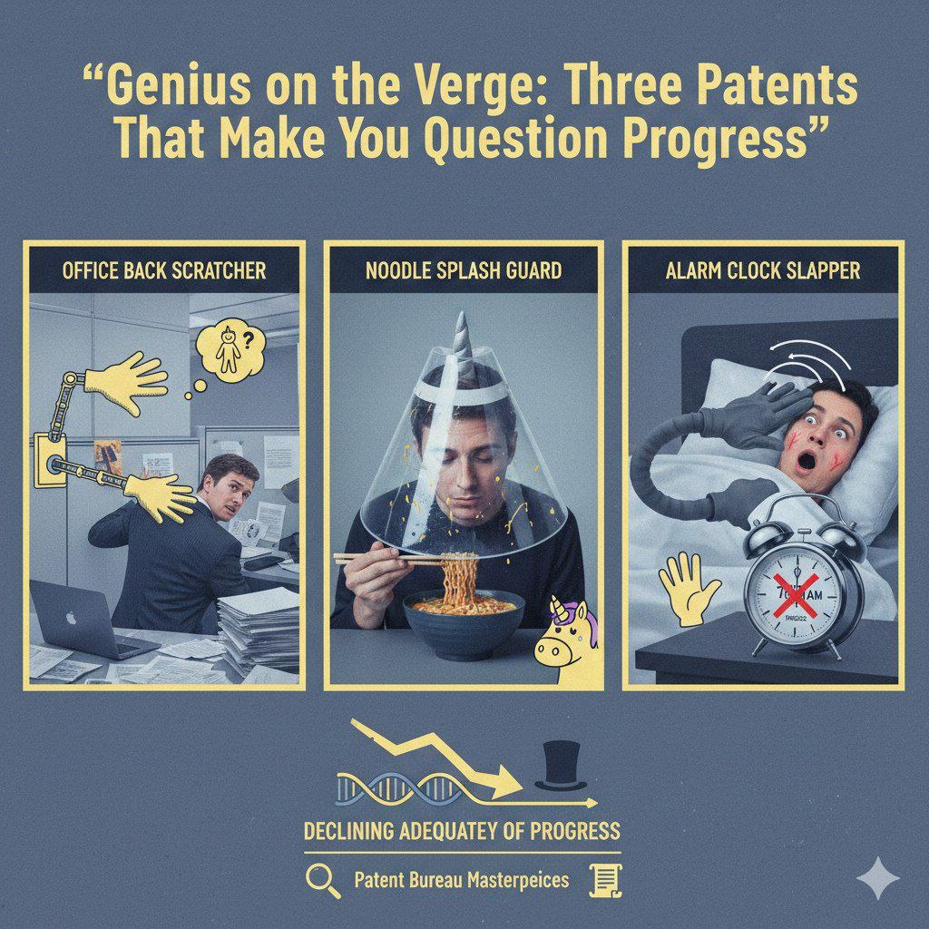 📉🧬🎩 Иногда кажется, что люди придумывают что-то только для того, чтобы вписать свое имя в историю, даже если это выглядит как реквизит для цирка. Шедевры патентного бюро 🔍📜 Чесалка для спины для офисных воинов. Существует патент на устройство, которое крепится к стене и имитирует движение человеческой руки. Видимо, изобретатель считал, что попросить коллегу или купить обычную палку — это слишком просто. 🖐️🏢 Защитный экран для поедания лапши. Это специальный конус, который надевается на лицо, чтобы во время поедания рамэна брызги бульона не пачкали одежду и волосы. Выглядит это так, будто вы — грустный единорог, который очень хочет обедать. 🍜🦄 Будильник, который бьет по лицу. Да, есть патент на устройство с резиновой рукой, которое начинает вращаться и отвечать вам пощечинами, если вы не нажали на кнопку выключения. Жесткий метод для тех, кому не помог даже «кнакер-ап» с горохом. ✋⏰ 📢 Чтобы получить патент, изобретение не обязательно должно быть полезным. Оно должн