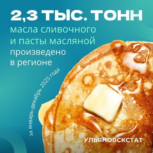 По данным Ульяновскстата за 2025 год в Ульяновской области было произведено 2,3 тысячи тонн сливочного масла и масляной пасты.