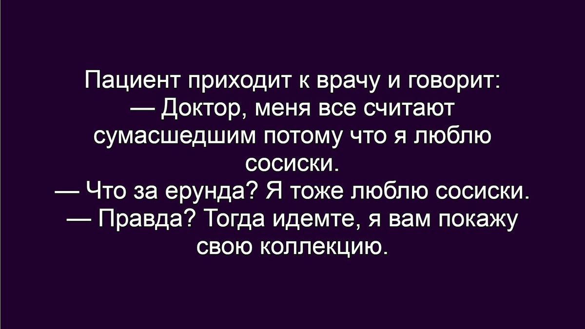 ☺☺☺ Идут два пьяницы по улице и один говорит другому: — Спорим на бутылку, что первое слово моей жены, когда меня увидит, будет "лапочка". — Да ты на себя глянь - пьяный, грязный... — Спорим! — Да я твою жену знаю - ведьма... — Спорим!!! — Ладно, спорим. Приходят к нему домой. — Лапочка, открой нам дверь. — Лапочка??? Да чтоб ты сдох, собака! ❗️❗️❗️ Наш Дзен: https://dzen.ru/anekdotyizv . Наш Телеграм: https://dzen.ru/id/625d2f00f1556857f5751a7b .
