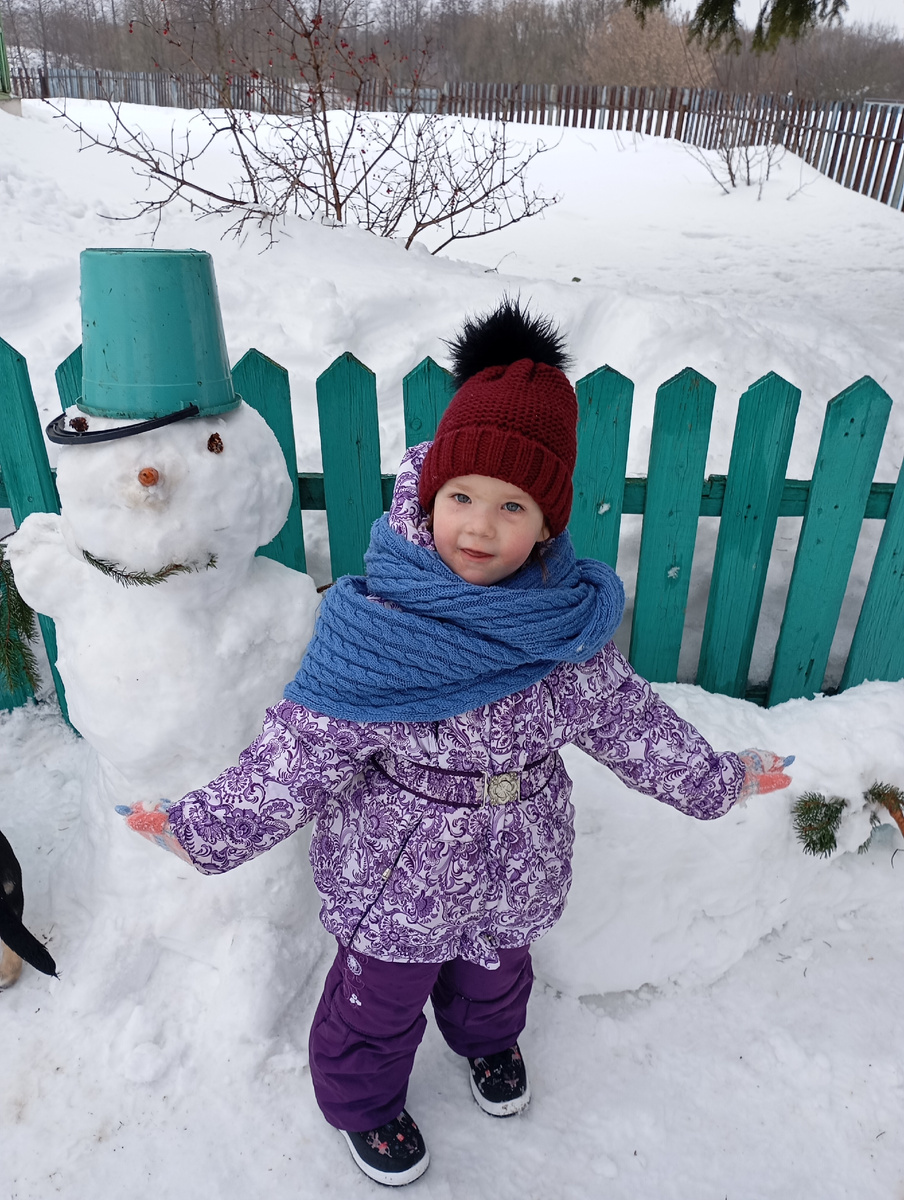 Снега пока ещё очень много,Маша даже успела снеговиков налепить😆