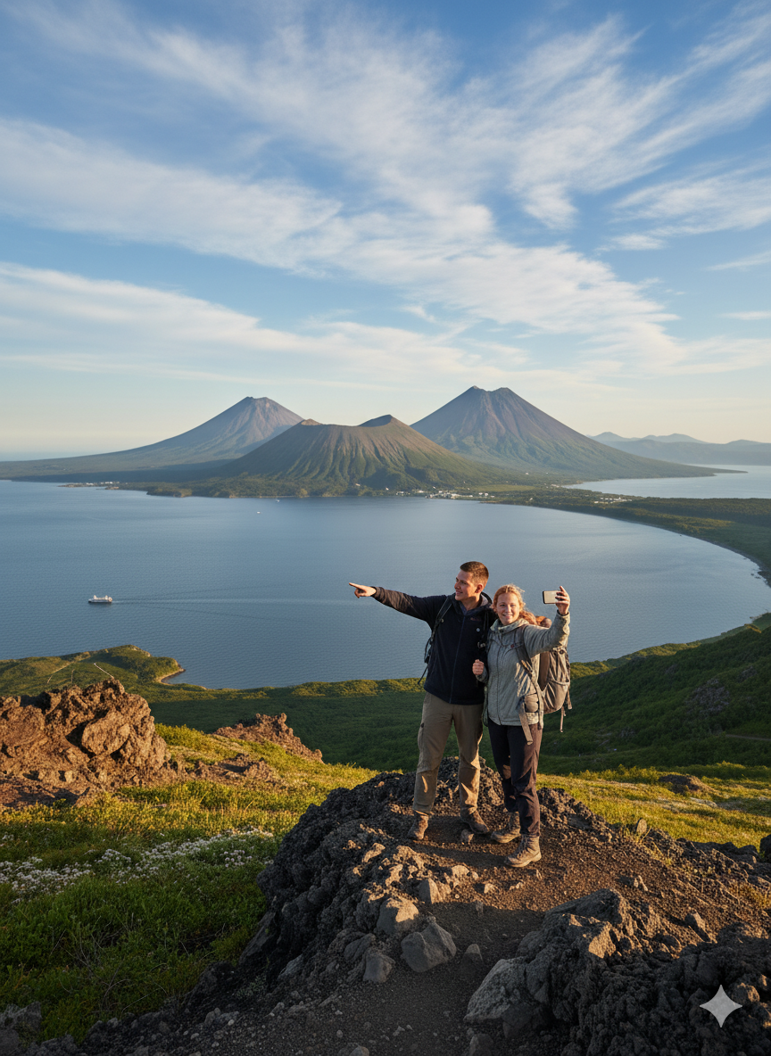 - Лучшее время для посещения: раннее утро в ясную погоду — больше шансов увидеть вулканы без облаков.