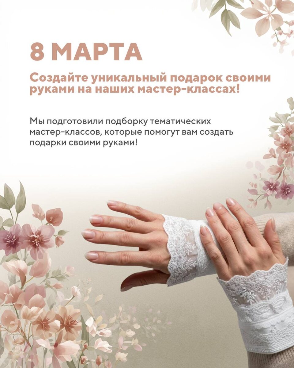 🌸💕 Весна уже стучится в двери, а вместе с ней приближается самый нежный и женственный праздник – 8 Марта! В честь этого мы подготовили для вас серию мастер-классов, на которых вы можете создать подарок для близкого человека или порадовать себя! Посмотреть все мастер-классы