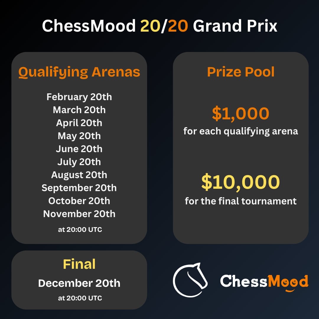 Lichess совместно с ChessMood рады представить ChessMood 20/20 Grand Prix 2026 — серию ежемесячных командных турниров с призовым фондом $20 000, открытых для всех команд стримеров Lichess! 📅 Турниры будут проходить 20-го числа каждого месяца в 20:00 по UTC с 20 февраля по 20 декабря 2026 года. Общий призовой фонд — $20 000, выделенный ChessMood: За каждую арену разыгрывается $1 000: $10 000 распределяются так: ⚠️ Все призы выплачиваются стримерам, а не отдельным игрокам. 💡 Каждый стример-участник также получает 10 месячных подписок ChessMood, которые он может раздать членам своей команды. Каждое событие проводится 20-го числа месяца в 20:00 UTC в формате командной битвы на 20 лидеров. 📌 Расписание квалификаций: За выступления в квалификациях команды получают очки: Итоговая квалификация учитывает топ-7 лучших результатов каждой команды.