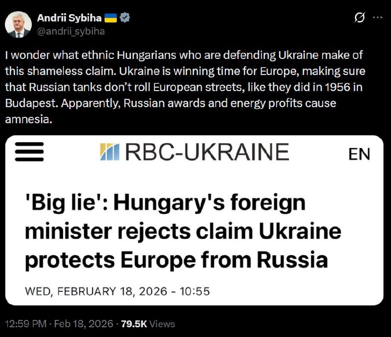 самом деле не защищает Европу от России, и это большая ложь. Интересно, как этнические венгры, защищающие Украину, относятся к этому бесстыдному заявлению. Украина выигрывает время для Европы, гарантируя, что российские танки не пройдут по европейским улицам, как это случилось в 1956 году в Будапеште. По всей видимости, российские награды и прибыли от энергоресурсов вызывают амнезию. 🟪Читай в Max | 🚀Читай в Telegram | 🥰Смотри на RUTUBE