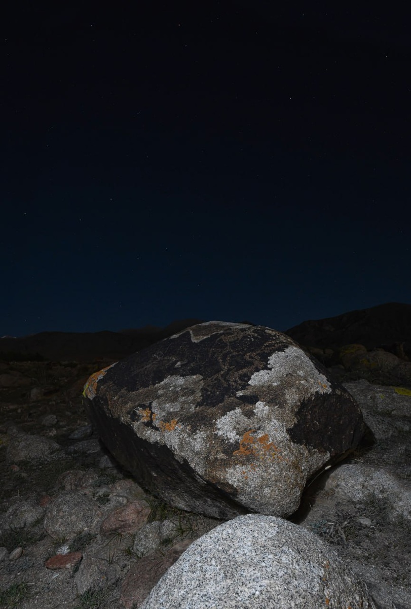Результат наших мистических экспедиционных прогулок по высокогорью Киргизии в прошлом году. Взяли камеру и пошли снимать петроглифы, потому что луна просто нереальная. Лунища! Да, снимала на очень длинной выдержке, но и светло было невероятно. От гор будто исходит легкое гало, а звезды успели сдвинуться во время съемки. А валуны руководитель экспедиции Максим Меньшиков подсветил ловко подброшенным фонариком. Вот что значит художественное чутье и практический опыт. Вообще я заметила, что если внимательно слушать и последовать совету Максима Юрьевича, можно с высокой вероятностью получить очень красивый снимок. Опытный путешественник замечает интересные места и необычные сюжеты, да и стратегию сьемки может подсказать. Вот пример моего личного творчества - на неудачных дублях, где луч света попал в кадр, получилось лазерное шоу.