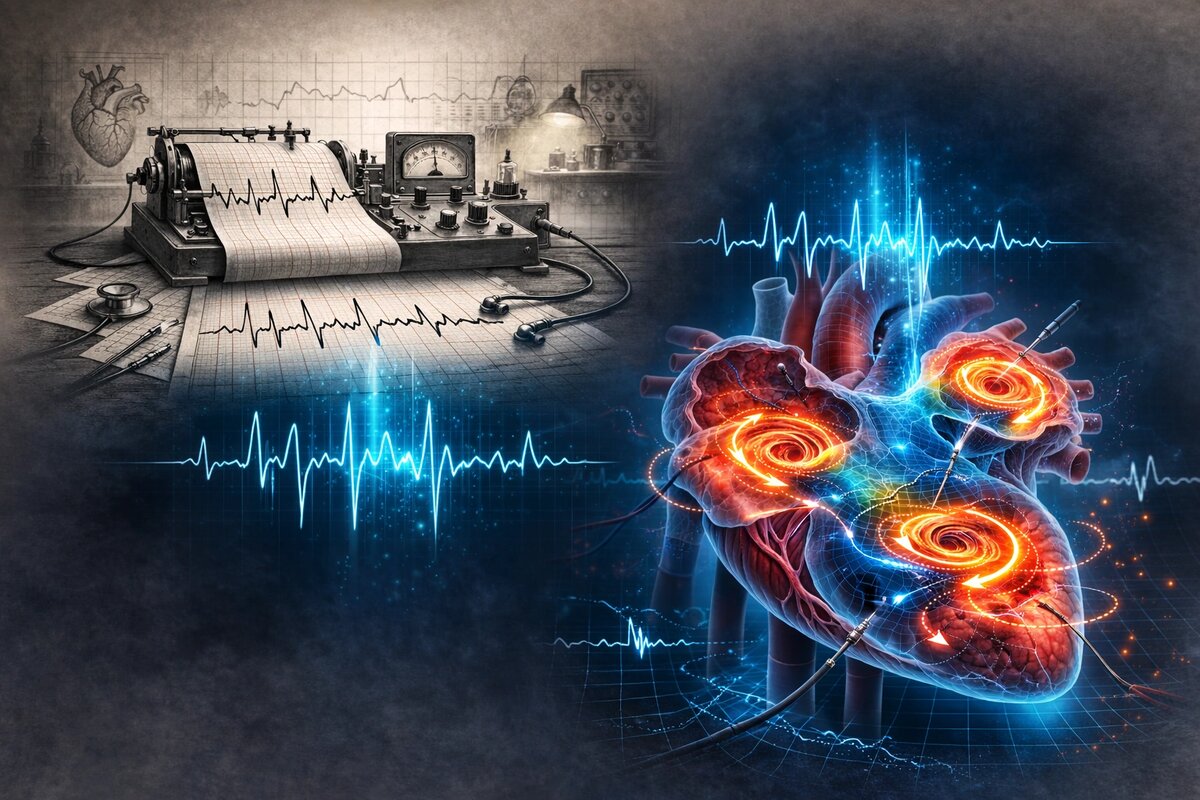 Настоящий прорыв произошёл в начале XX века, когда появилась электрокардиография. Именно ЭКГ позволила не просто зафиксировать неровный ритм, а увидеть его электрическую природу. С этого момента начинается современная история понимания фибрилляции предсердий (ФП).