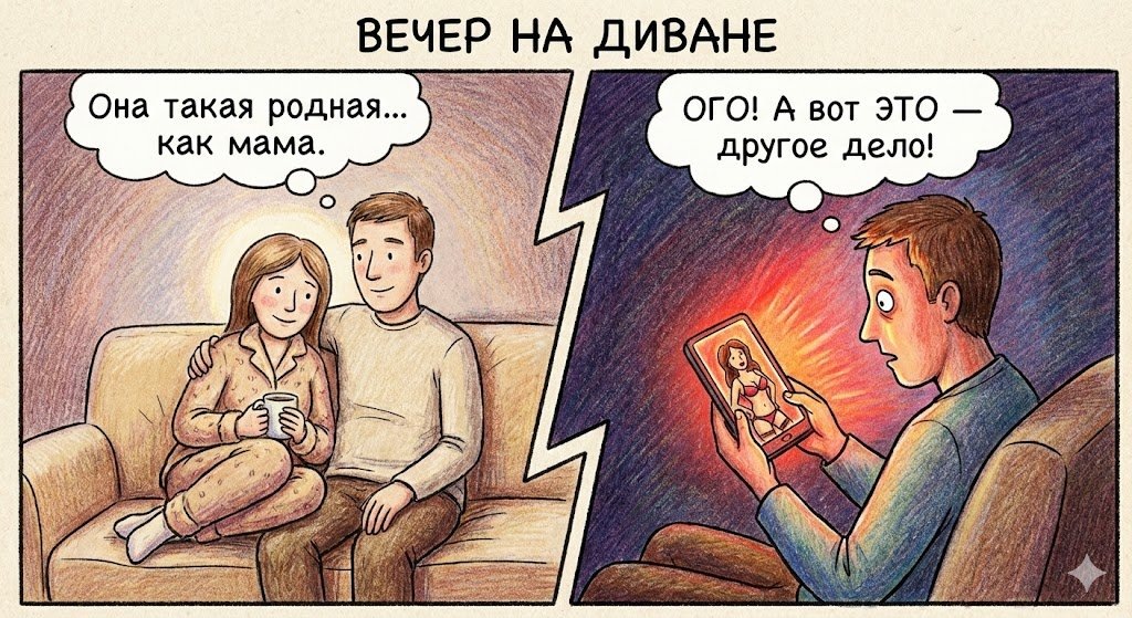 Вечер вторника. Дети наконец-то уложены и сопят в своих кроватках. На кухне тихо гудит посудомойка. Ты сидишь на диване с телефоном, листаешь ленту. В комнату заходит жена. Она в пижаме с мишками, волосы собраны в небрежный пучок, лицо умытое, родное. Она устало улыбается, спрашивает: «Чай будешь?» и садится рядом, прижимаясь к твоему плечу. В этот момент ты чувствуешь огромную волну тепла. Ты действительно её любишь. Она твой лучший друг, твой тыл, великолепная мать твоих детей. Ты готов отдать за неё жизнь. Но есть одна проблема. Ниже пояса абсолютный штиль. Ты смотришь на неё и понимаешь: заняться с ней сейчас животным, страстным сексом это как... как в церкви выругаться матом. Неловко. Неправильно. Она же родная. Она же мама. Зато полчаса назад, когда в ленте мелькнула случайная фитоняшка в откровенном белье, реакция была мгновенной. Почему так? Ты сломался? Ты разлюбил? Нет. Добро пожаловать в ловушку, которую дедушка Фрейд назвал «Комплекс Мадонны и Блудницы». И ключи от этой лов