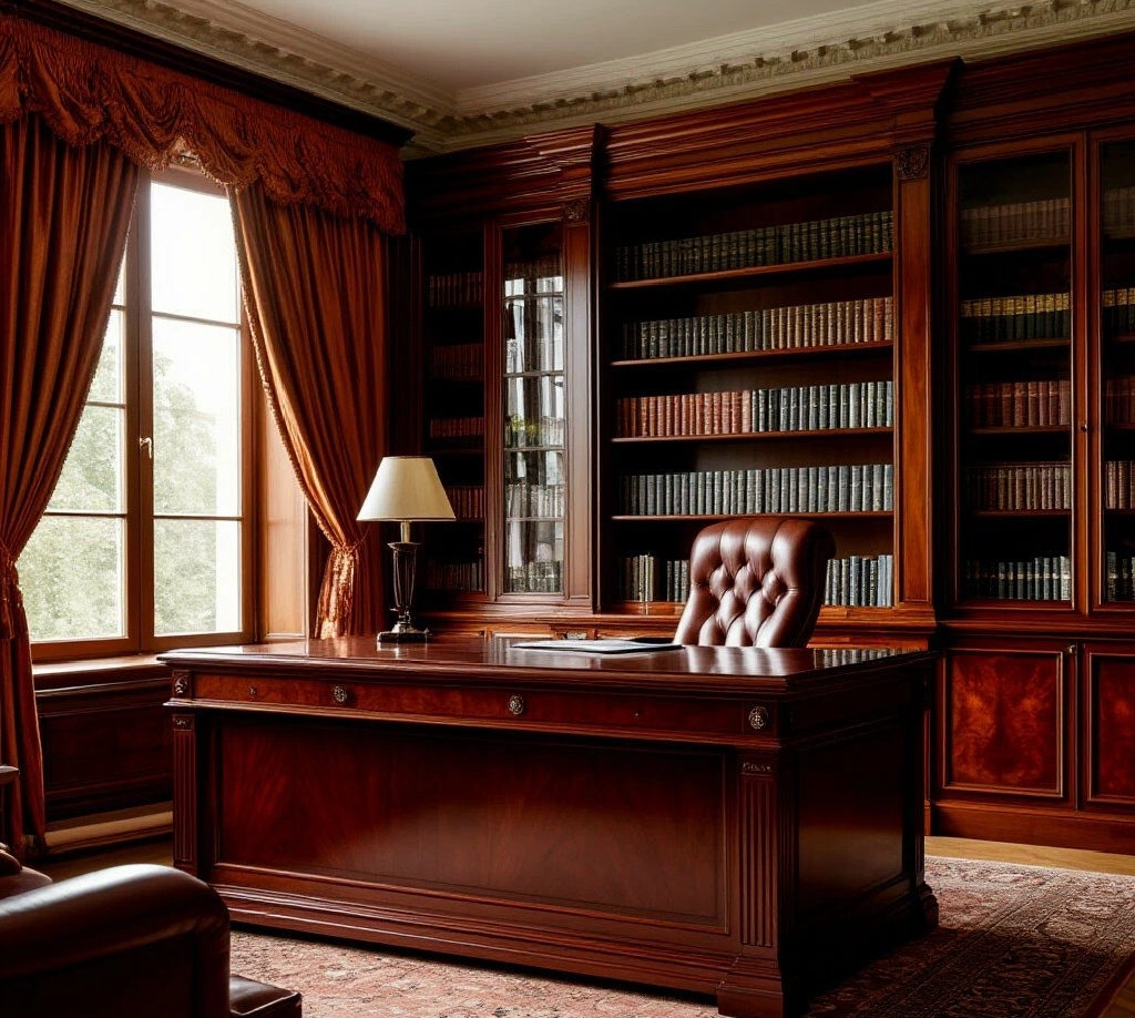 Тяжёлые портьерные шторы цвета бордо, как и всё в этом кабинете.