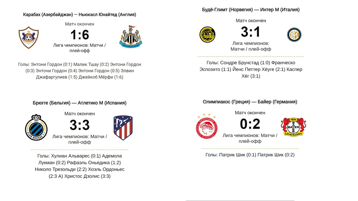 Привет, друзья. Продолжаются первые стыковочные матчи Лиги Чемпионов 2025/2026 г. Сегодня состоялось ещё 4 игры. Карабах – Ньюкасл 1:6. После первого тайма Ньюкасл вёл с фантастическим счетом 5:0. Энтони Гордон – повторил рекорд ЛЧ, оформив покер в первом тайме. Ранее подобное удавалось бразильцу Луису Адриано из Шахтёра. Гордон признан игроком матча забив 4 мяча из шести. За хозяев отличился Джафаргулиев. Будё/Глимт – Интер 3:1. К 30-й минуте команды обменялись голами. А на исходе часа игры гости из Италии пропускают дважды. Хеуге забивает в «девятку», Хег – в пустые ворота. Сенсационная победа Будё/Глимт. Напомню, вчера крупно уступил другой итальянский клуб Ювентус. Брюгге – Атлетико 3:3. На 8-й минуте счет в игре с пенальти открыл Альварес. Лукман под перерыв удваивает счет. Брюгге к 60-й минуте удалось отыграться, затем забить в собственные ворота и в конце спасти ничью. Ответный матч через неделю, уверен, Атлетико возьмёт своё и пройдёт в 1/8 финала. Олимпиакос – Байер 0:2. Побед