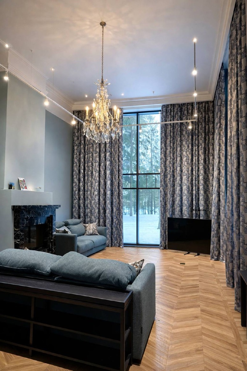 Ткань более 5 метров, точный расчёт, идеальная посадка. Геометрический принт здесь работает как продолжение архитектуры. Он подчёркивает масштаб, делает пространство цельным. Мы берёмся за сложные объекты. И любим высоту.