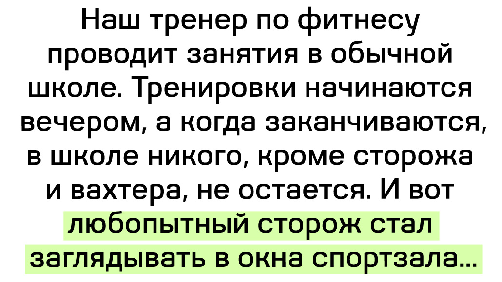 Наш тренер по фитнесу проводит занятия в обычной общеобразовательной школе. Тренировки начинаются вечером, а когда заканчиваются, в школе никого, кроме сторожа и вахтера, не остается. И вот любопытный сторож стал заглядывать в окна спортзала. Как долго продолжались его наблюдения, неизвестно. Однажды вечером, закрывая за нами ворота школы после занятия, мужчина похрабрел и выдал: «До свидания! Хорошие у вас здесь занятия, беременные женщины занимаются». Мы остолбенели. Но мотивации на активные занятия прибавилось. © LadaTeplova / Pikabu