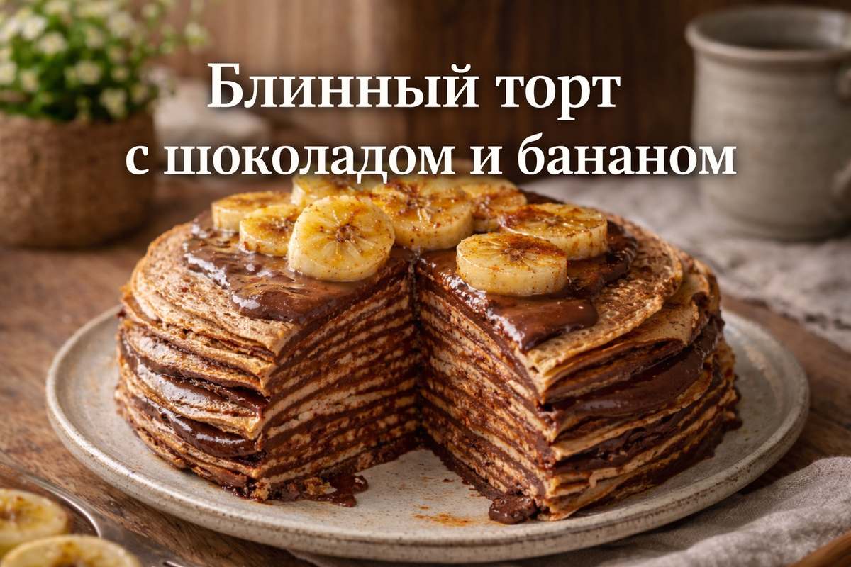 Этот вариант блинного торта более десертный. Шоколадный крем, карамелизированные бананы, тонкие блины… Идеально к кофе или чаю.