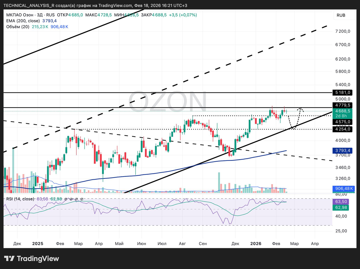 Мысли про Озон Ozon упёрся в 4780. Уже дважды туда ходили и оба раза продавцы включались. Пока уровень не пробит и нет закрепа выше, импульса дальше не будет. Если 4780 берут и закрепляются, тогда открывается движение к 5000-5180. Потенциал около 5-8%. Если снова не пробивают и появляется слабость, логичен откат к нижней границе канала в район 4280-4300. Вероятность коррекции сейчас примерно 55%, продолжения роста без пробоя - низкая. Ключ простой - либо пробой 4780 и ускорение, либо откат к 4300 для нового набора.