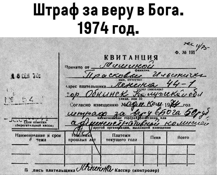 Это один из самых смешных антисоветских фейков, которые только приходилось встречать. Подделку выдают сразу несколько деталей. Неправильный порядок заполнения адреса. В советское время существовал строгий стандарт (трафарет) написания адреса на бланках и конвертах: начинали с индекса, затем указывали область, город, улицу и только потом дом. Обратный порядок (с улицы) не применялся в официальных документах. Орфографическая ошибка. В официальной квитанции того времени слово «бог» писалось бы исключительно со строчной буквы, так как это было грамматической нормой в атеистическом государстве уже много лет. Написание с большой буквы — явный признак современной подделки, выданной религиозным или просто неграмотным автором. Абсурдная сумма штрафа. 50 рублей — совершенно нетипичная сумма для административного взыскания тех лет. Стандартные штрафы составляли 5, 10, 15 рублей. Даже за такое серьезное нарушение, как хулиганство в общественном месте, штраф редко превышал 20–25 рублей. Автор фейка