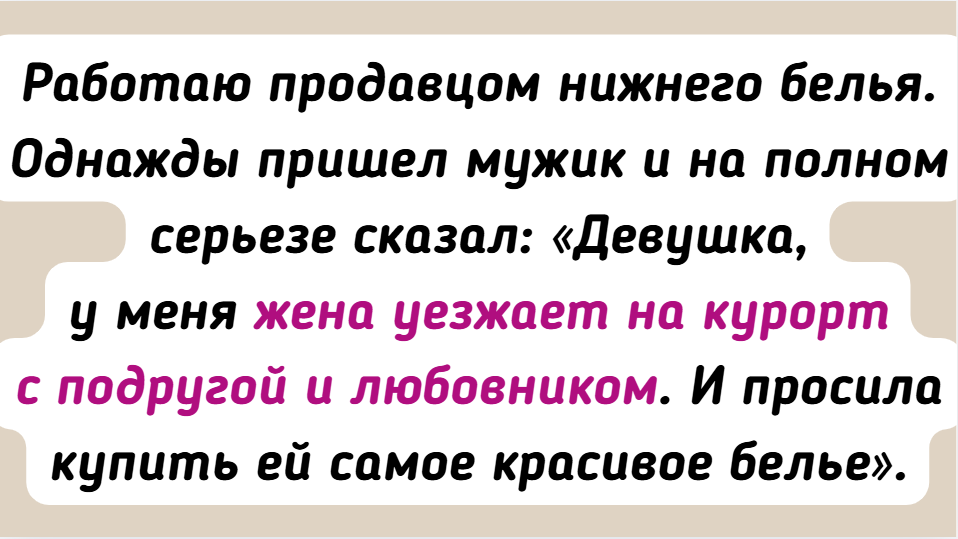 - Работаю продавцом нижнего белья. Однажды пришел мужик и на полном серьезе сказал: «Девушка, у меня жена уезжает на курорт с подругой и любовником. И просила купить ей самое красивое белье». Вот тут я удивилась.
