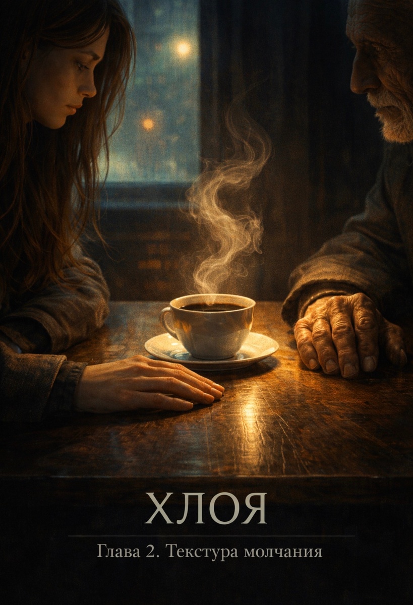 Вчера я составила каталог. Сегодня я выхожу из дома. Коробка с экспонатами остаётся на столе. Крышка открыта. Вещи дышат там, в полумраке комнаты. Я закрываю дверь. Замок сухо щёлкает. Этот звук отрезает меня от вчерашнего дня. Я иду по городу. Воздух холодный, колючий. Он проникает в лёгкие ледяными иглами. Я не кутаюсь в шарф. Пусть холод касается кожи. Пусть напоминает: я живая. Асфальт под ногами твёрдый, шершавый. Каблуки ритмично стучат. Тук. Тук. Тук. Это пульс города. Я чувствую второй слой. Сегодня он тонкий, как плёнка. Сквозь бетон проступают контуры других зданий. Они светятся изнутри тусклым медовым светом. Тени на стенах не совпадают с источниками света. Они живут своей жизнью. Ползут вверх. Сплетаются друг с другом. Я прихожу туда. Кофейня в арке. Та самая. Толкаю дверь. Колокольчик звенит тихо, словно под водой. Внутри тепло. Пахнет корицей и старым деревом. Он сидит у окна. Старик из визитки. Я не удивляюсь. Я знаю, что он здесь. Я подхожу. Сажусь напротив. Стул скрипи