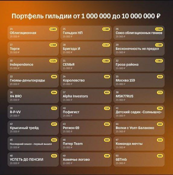 ! Ребята, активисты - большие молодцы и очень крутые! Собрали гильдию у известного брокера, нашего любимого Т-Банка. И наша гильдия "Союз облигационных гениев" - заняла призовые места. Каждый участник гильдии получит денежные призы, дважды! Вот такие дела! Спасибо Вам друзья за активность! Отдельное спасибо, Владиславу и Жене! Спасибо, дорогие друзья! Сердечно всех поздравляю. 🔥 Кстати, у нас в чате ребята объединялись в ещё одну Гильдию. Но, о еë успехах мне узнать - не удалось.