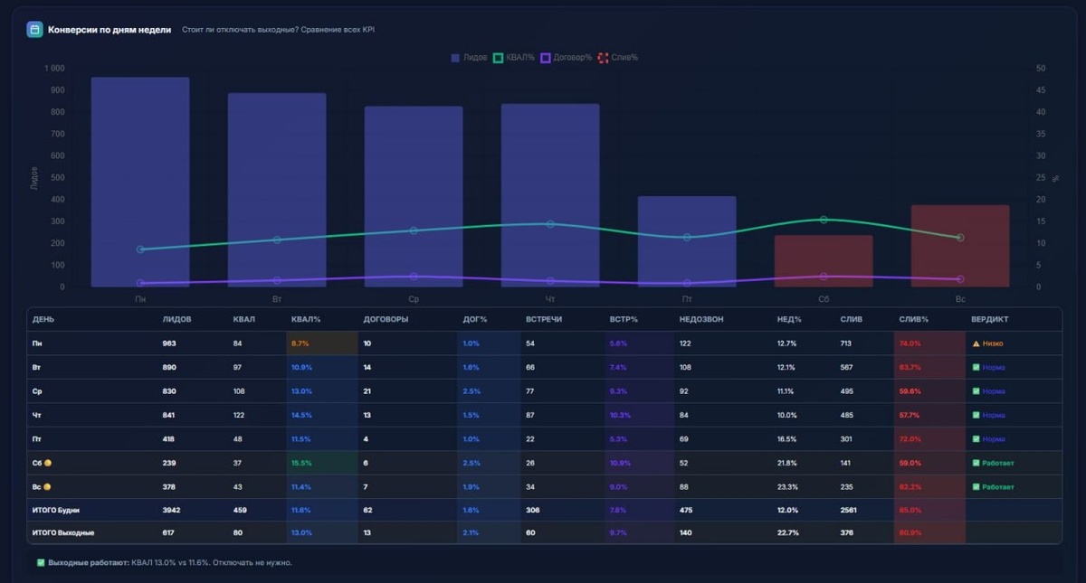 Ну вот и думайте теперь что с этим делать😁 Вывели исторические данные по конверсии/ по дням недели