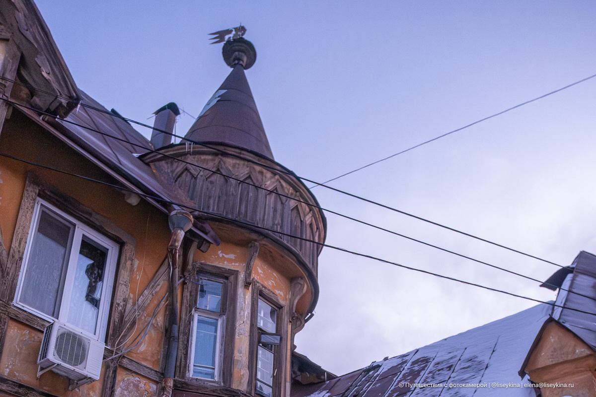 Я пришла к этому дому зимним утром, когда в Самаре было -25. Воздух звенел, снег хрустел так, что казалось — слышно на весь двор. Фахверк на морозе выглядел особенно контрастно: тёмные балки и светлые стены, башенка, флюгер. Всё аккуратно, почти по-европейски. Если бы не соседние постройки и типичный самарский двор, можно было бы на секунду забыть, где ты находишься.