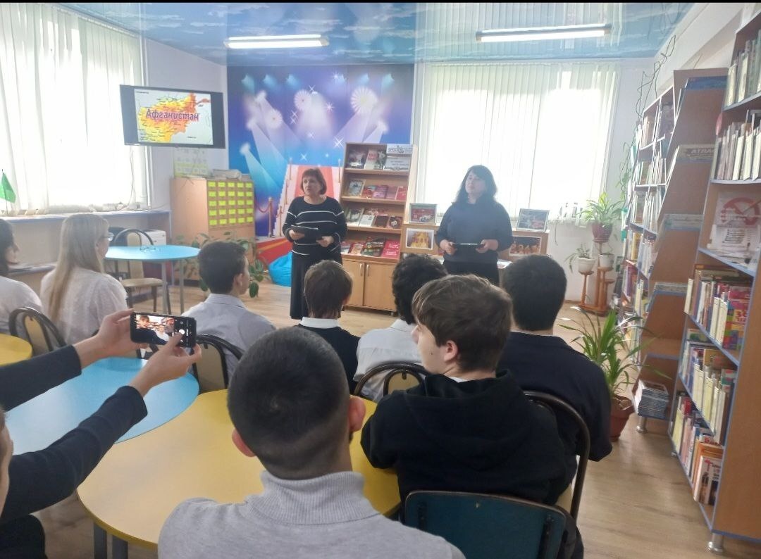 дни ушедших в вечность», к 37-й годовщине вывода советских войск из Афганистана, для уч-ся 9 «А» кл. МБОУ СШ №6 (кл.рук. Натхо З.Б.). К данному событию была оформлена выставка с материалами о ветеранах-афганцах поселка. Библиотекари рассказали детям о причинах ввода советских войск в Афганистан, ключевых событиях, о трудностях, с которыми столкнулись советские солдаты в чужой стране, как мужественно они выполняли свой долг. Почётным гостем стал воин-интернационалист Рагимов Рашид Рагимович, который рассказал о службе сапёром в Афганистане в 1986–1988 гг. За время службы ему удалось обезвредить более 100 мин противника. Он был награжден двумя орденами Красной Звезды и медалями. После завершения службы он окончил Краснодарский мединститут и сейчас работает стоматологом в Энеме. Учащиеся с интересом изучали армейский альбом гостя. Мероприятие завершилось показом видео ролика «Мы уходим...»