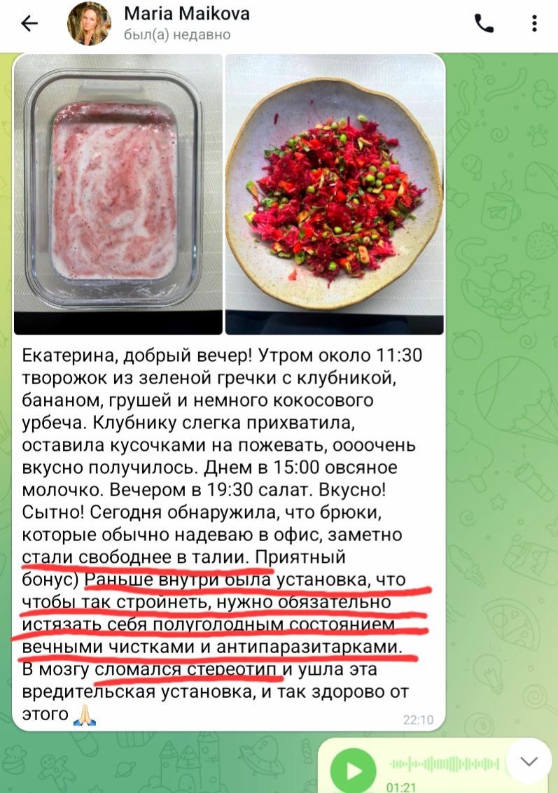 Друзья, прямо сейчас работаем с Марией по настройке ее рациона. Пока провели только 3 занятия, но результаты уже очень радуют!
