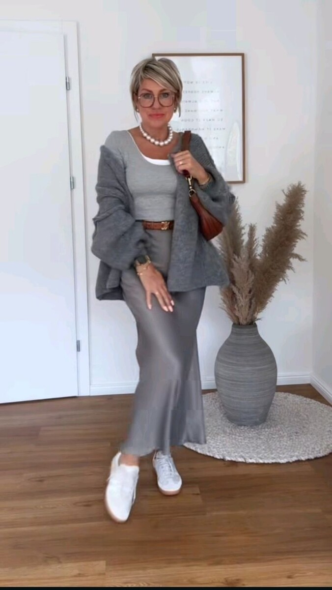 - Женственный и элегантный аутфит можно составить, используя длинную серую юбку из атласной ткани, светло-серую футболку с белой отделкой в области воротника и темно-серый вязаный пиджак оверсайз. Подходящая обувь – белые кроссовки на шнуровке. Дополнительные детали: тонкий коричневый ремень, бусы, кожаная сумка.