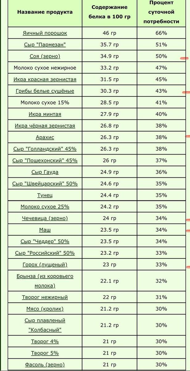 Сравнительная таблица содержания белка в различных продуктах. Справа красным отмечены продукты растительного происхождения