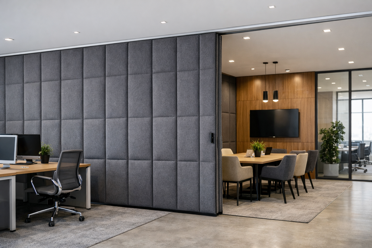 Мягкая раздвижная перегородка — это конструкция на направляющих, состоящая из многослойных акустических панелей, которые: