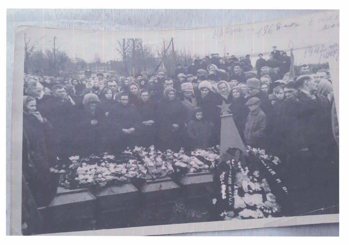 Все в Шимске знали, где был "ДЗОТ" (деревоземляная огневая точка) - место расстрела шимчан, но только в 1968-м году нашли тела и захоронили. В семье у многих была фотография дня похорон, но только на одной стояла дата события. Эта фотокарточка нашлась всего пару лет назад при разборе вещей умершей дочки Николая Васильевича - Анны. Все это время мы высчитывали год по событиям в нашей жизни: - Я мелкий был. - Я не приехала из-за сессии. - У меня только дочка родилась, но я поехала