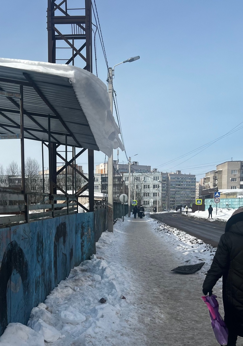 Огромное количество школьников, детей , взрослых идут по этой «тропе» . И сверху висит ледяной «гриб». Вопрос: чего ждем? Кому на голову съедет? Где ответственные за бардак товарищи?