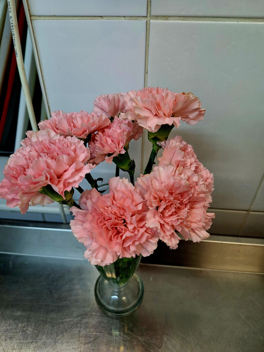 А тут прихожу на работу, стоит стаканчик с розовыми гвоздиками. Недавно был праздник всех влюблённых, на столах стояли маленькие вазочки с красной, белой розочкой и гвоздикой. Розочки куда-то делись, а гвоздики к нам на мойку перекочевали. Там холодно, гвоздички не вянут, а мы в двух кофтах мёрзнем. Любуемся.