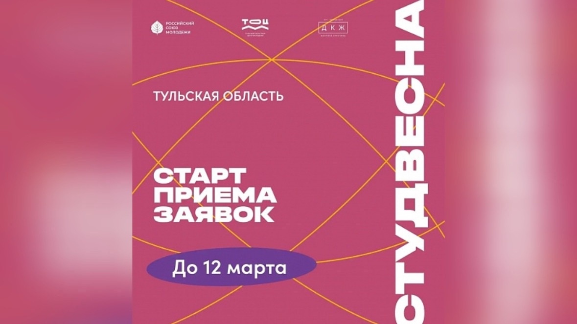 В Тульской области начался прием заявок на региональный этап Всероссийского фестиваля «Студенческая весна». Участвовать могут студенты вузов и колледжей региона. Организаторы — Тульский областной центр молодежи и региональное отделение Российского Союза Молодежи — проводят мероприятие в рамках нацпроекта «Молодежь и дети». Заявки принимаются до 12 марта. Чтобы стать участником, нужно заполнить форму и подать заявку на сайте ФГАИС «Молодежь России». Фестиваль пройдет по девяти направлениям: вокал, инструментальное исполнительство, танец, театр, оригинальный жанр, медиа, видео и арт. Для направлений «Медиа», «Видео» и «Арт» можно подать готовые работы. Остальные номинации предполагают живое выступление. В жюри регионального этапа войдут федеральные эксперты творческих проектов «Таврида АРТ». Победители и лауреаты выступят на гала-концерте «Тульской студенческой весны». В 2025 году в отборочных турах участвовали более 800 студентов из 30 учебных заведений. Гран-при завоевали коллективы ТГ