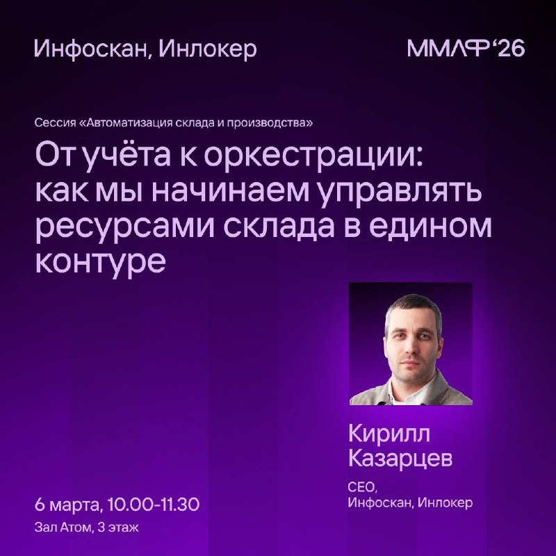 Цена участия. ММЛФ стоит дорого - и, на мой взгляд, оправданно. Туда едут люди, которые реально двигают складскую логистику в России и СНГ. Конференция проходит 2–6 марта в кластере «Ломоносов» в Москве. Будет обидно, если кто-то из вас не попадёт просто из-за того, что не успели разобраться с билетами. Поэтому, чтобы ускорить процесс, я договорился о скидке 20% от организаторов и добавил ещё 30% от себя. Итого у меня есть 10 промокодов на скидку 50%. Условия получения 50% скидки: 1. Вы используете любой из наших продуктов (Инлокер, Инфоскан, Мулинет, Кулон) или планируете покупку в ближайшее время. 2. Не более двух человек от одной компании. 3. Активировать промокод нужно до 26 февраля. 3. Вы придёте на моё выступление =) 6 марта я выступаю в сессии про автоматизацию склада и производства. Тема: «От учёта к оркестрации: как мы начинаем управлять ресурсами склада в едином контуре». Последние несколько месяцев я пытаюсь чётко сформулировать, куда мы идём с нашими продуктами - с у