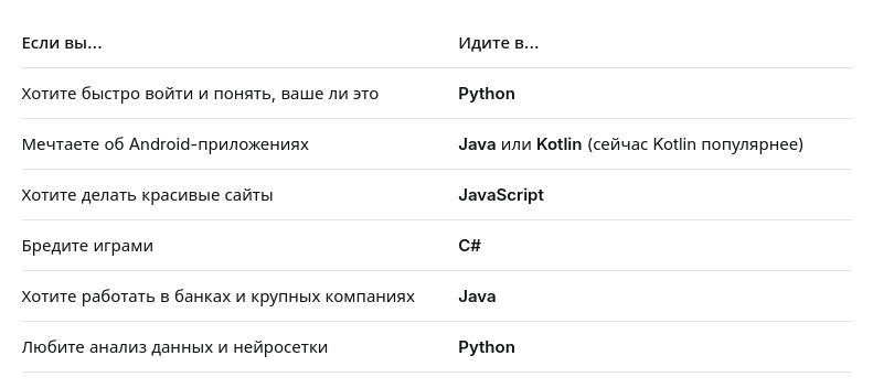 Голова идёт кругом, да? Давайте спокойно, без фанатизма, разберём четвёрку лидеров. Я расскажу, для чего каждый язык подходит, кому зайдёт, а кому — нет. Для чего: Бэкенд сайтов, телеграм-боты, анализ данных, нейросети, автоматизация (написать скрипт, который сам переименует 1000 файлов). Плюсы: Минусы: Кому зайдёт: Стартовая зарплата (РФ, 2024): 60-90 тыс. руб. Для чего: Огромные банковские системы, сложные бэкенды, Android-приложения (официальный язык для Android). Плюсы: Минусы: Кому зайдёт: Стартовая зарплата (РФ, 2024): 70-100 тыс. руб. Для чего: Фронтенд (то, что вы видите в браузере — кнопки, анимации), бэкенд (через Node.js), мобильные приложения (через React Native). Плюсы: Минусы: Кому зайдёт: Стартовая зарплата (РФ, 2024): 60-90 тыс. руб. Для чего: Игры на Unity (половина мобильных игр сделана на C#), бэкенд на Windows, программы для Microsoft. Плюсы: Минусы: Кому зайдёт: Стартовая зарплата (РФ, 2024): 60-90 тыс. руб. (в геймдеве может быть ниже). Мой личный совет новичку: